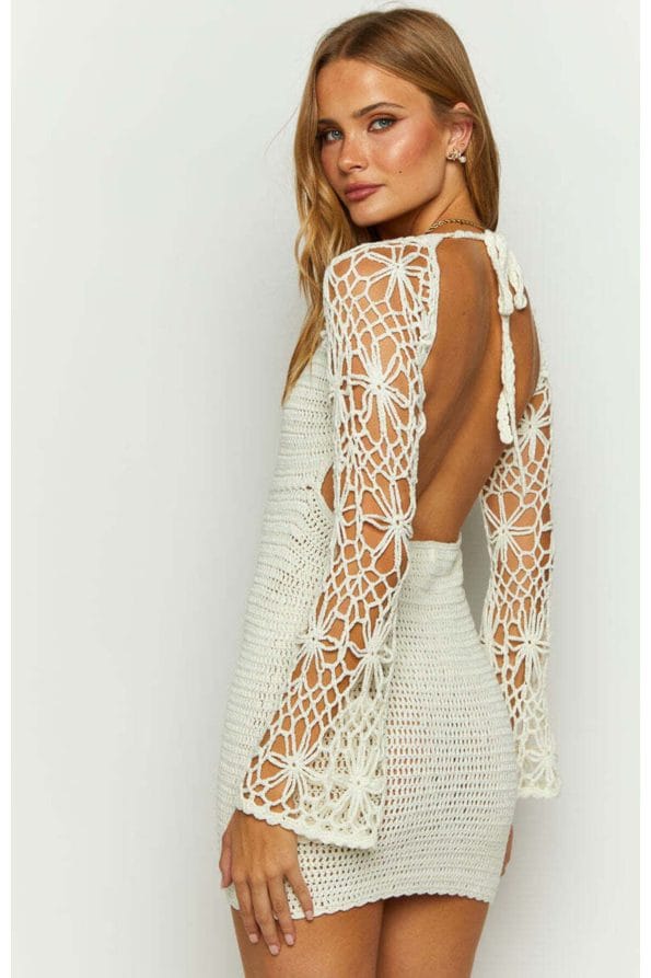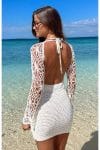 El Örgüsü Beyaz Sırt Dekolteli Plaj Elbisesi