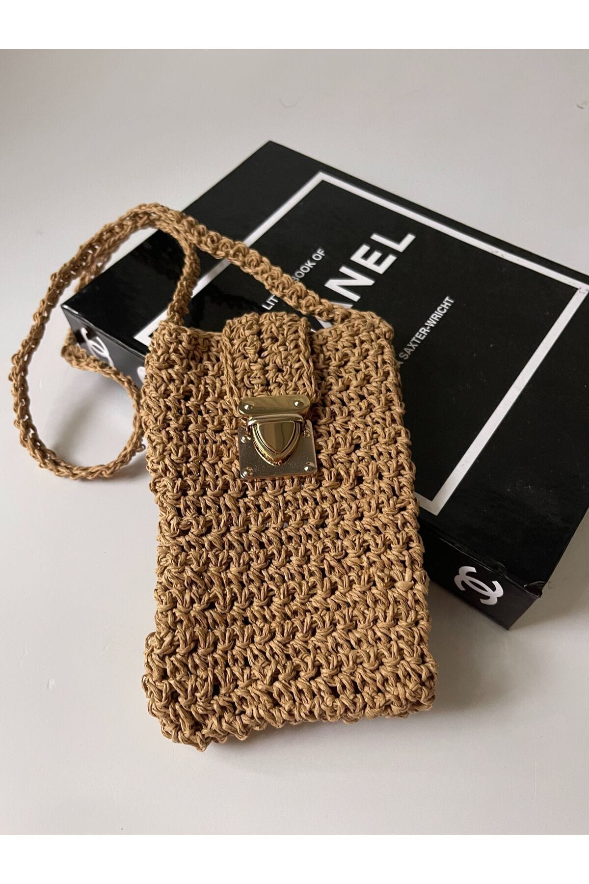 El Örgüsü Gold Aksesuarlı Hasır Telefonluk Omuz Çantası