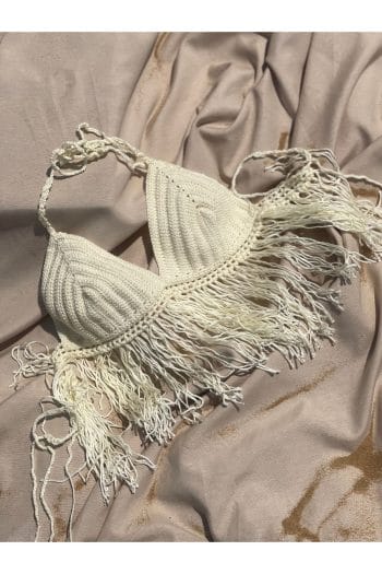 - El Örgüsü Bej Püsküllü Üçgen Bikini Üstü